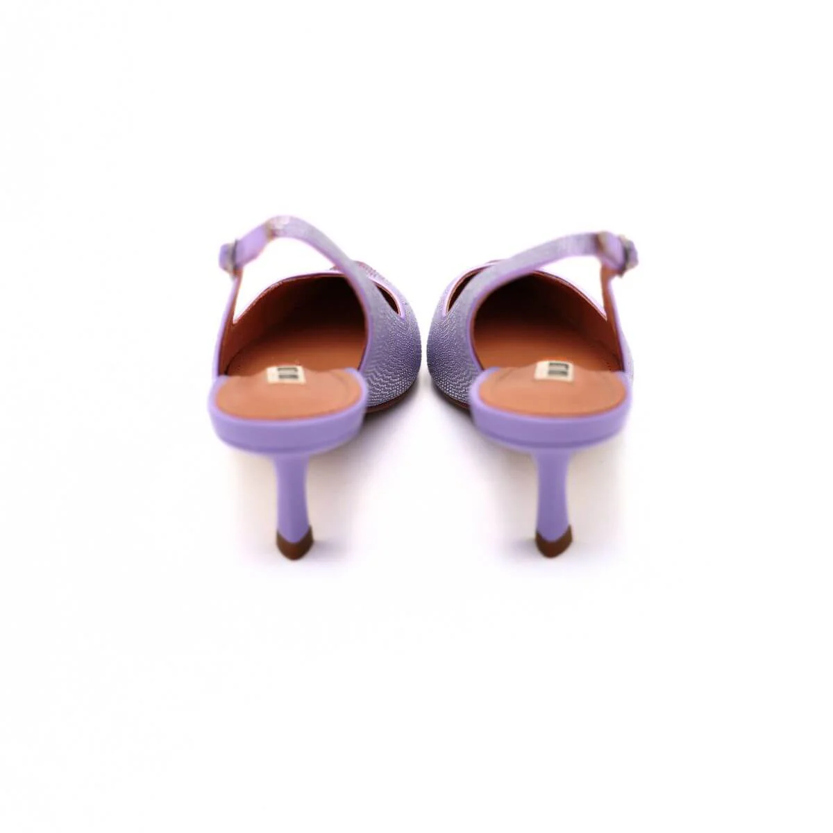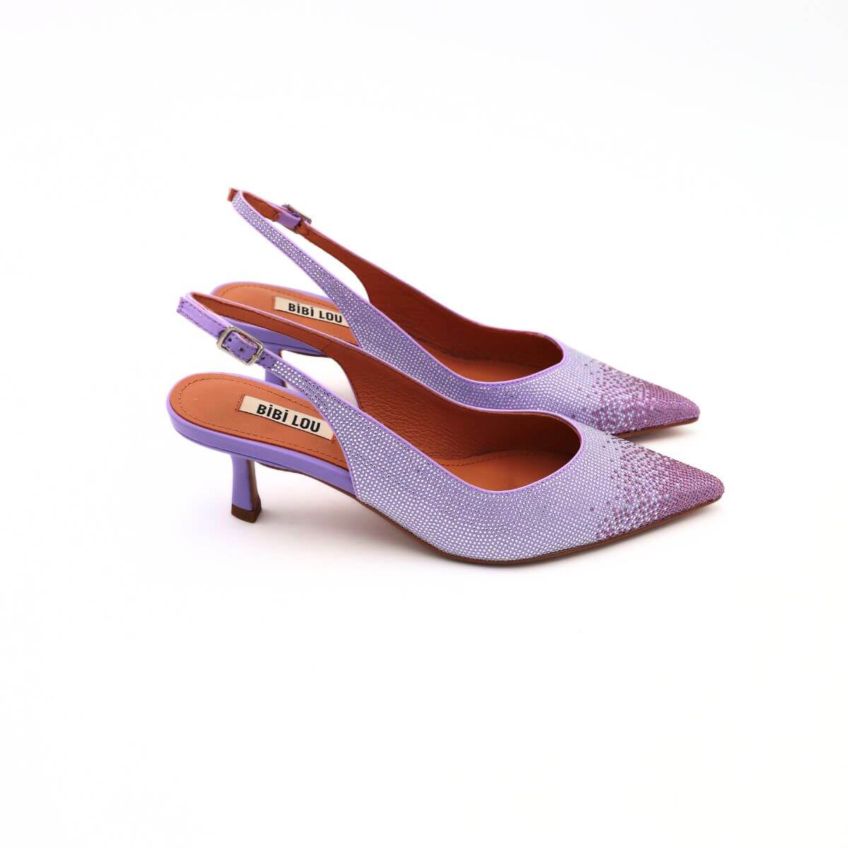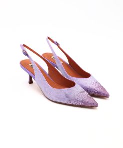 Slingback da donna di BIBI LOU, realizzata in raso lilla con strass. Interno e sottopiede in pelle. Chiusura con cinturino regolabile. Suola in effetto cuoio con tacco sottile 5cm. Ideale per le tue cerimonie o per le tue serate.