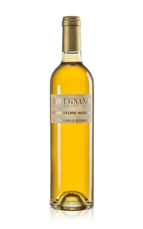 Orvieto Classico Muffa Nobile Doc. Grechetto e Procanico 60%, Sauvignon Blanc 35%, Semillon 5%. Un vino dolce, da meditazione, proveniente da alcuni vigneti che, per fortunata combinazione microclimatica, sono colpiti da muffa nobile (pourriture noble in francese). Una meticolosa vendemmia in più passaggi successivi, una pressatura immediata e una lunga fermentazione permettono di ottenere questa nostra rarità: un vino prezioso, squisito, strettamente naturale.