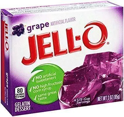 Jell-O Grape Gelatina Preparato per gelatina dalla consistenza perfetta al gusto di uva. Facilissima da fare con la sola aggiunta di acqua! Divertiti con i tuoi amici con questo delizioso preparato per gelatina!