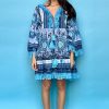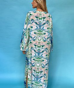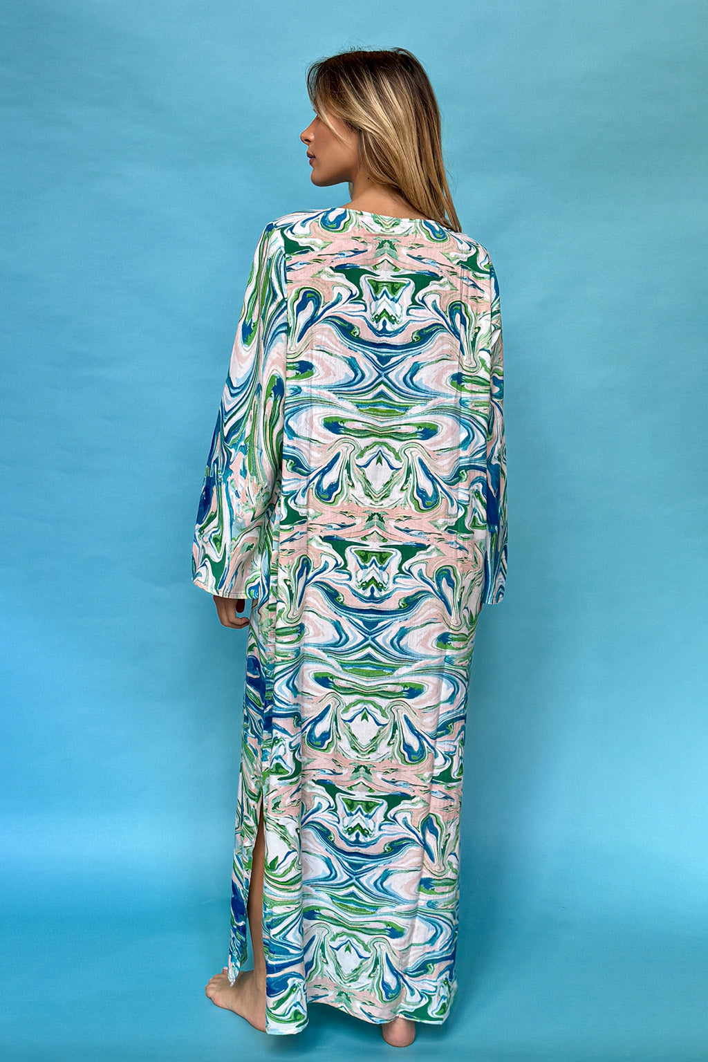 La scollatura è impreziosita da composizioni luminose e le maniche, lunghe e ampie, donano al modello l’allure tipica della moda mare Positano, caratterizzata da uno stile inconfondibile.