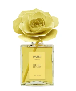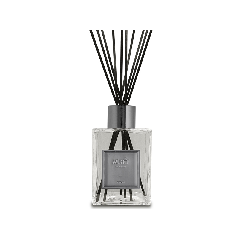 Elegante vetro, in diversi formati che, con finiture in ecopelle lucida effetto metallo, danno eleganza e stile al diffusore di fragranza con bastoncini in fibra.