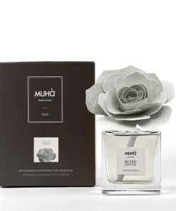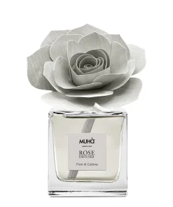 Una raffinata confezione in bottiglia di vetro, con diffusore a forma di rosa in legno di betullanaturale realizzato a mano.