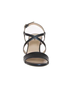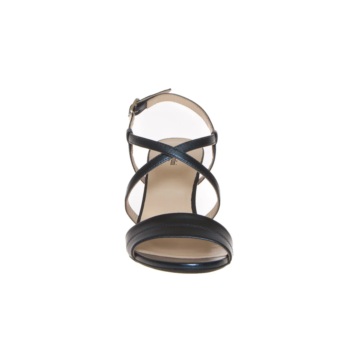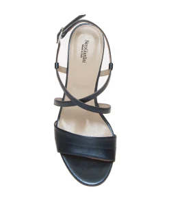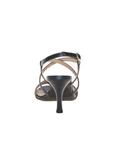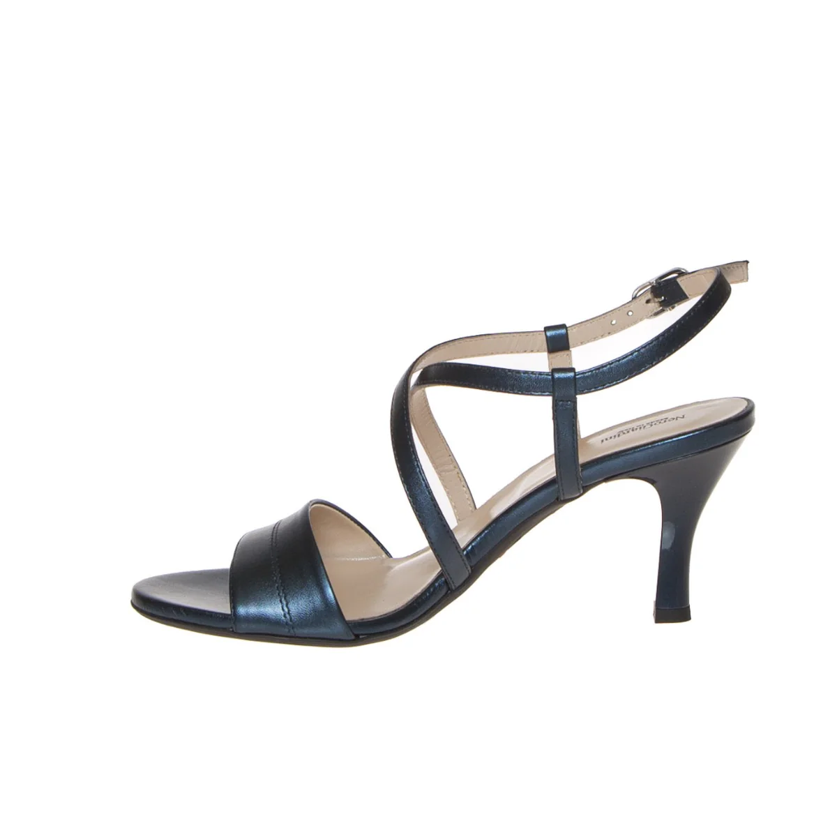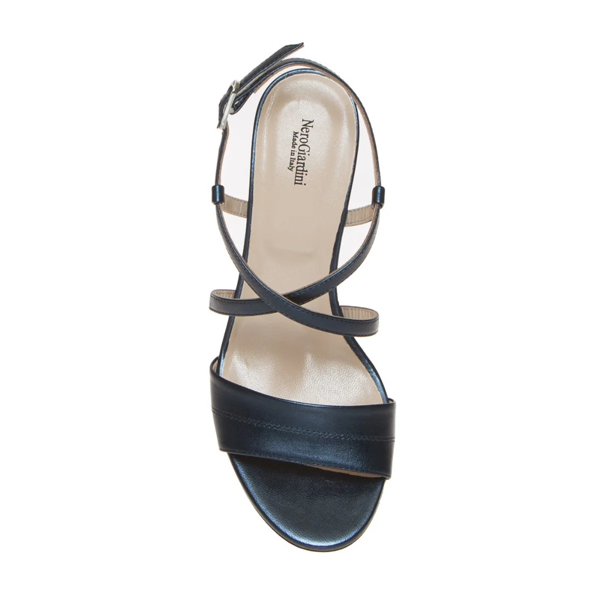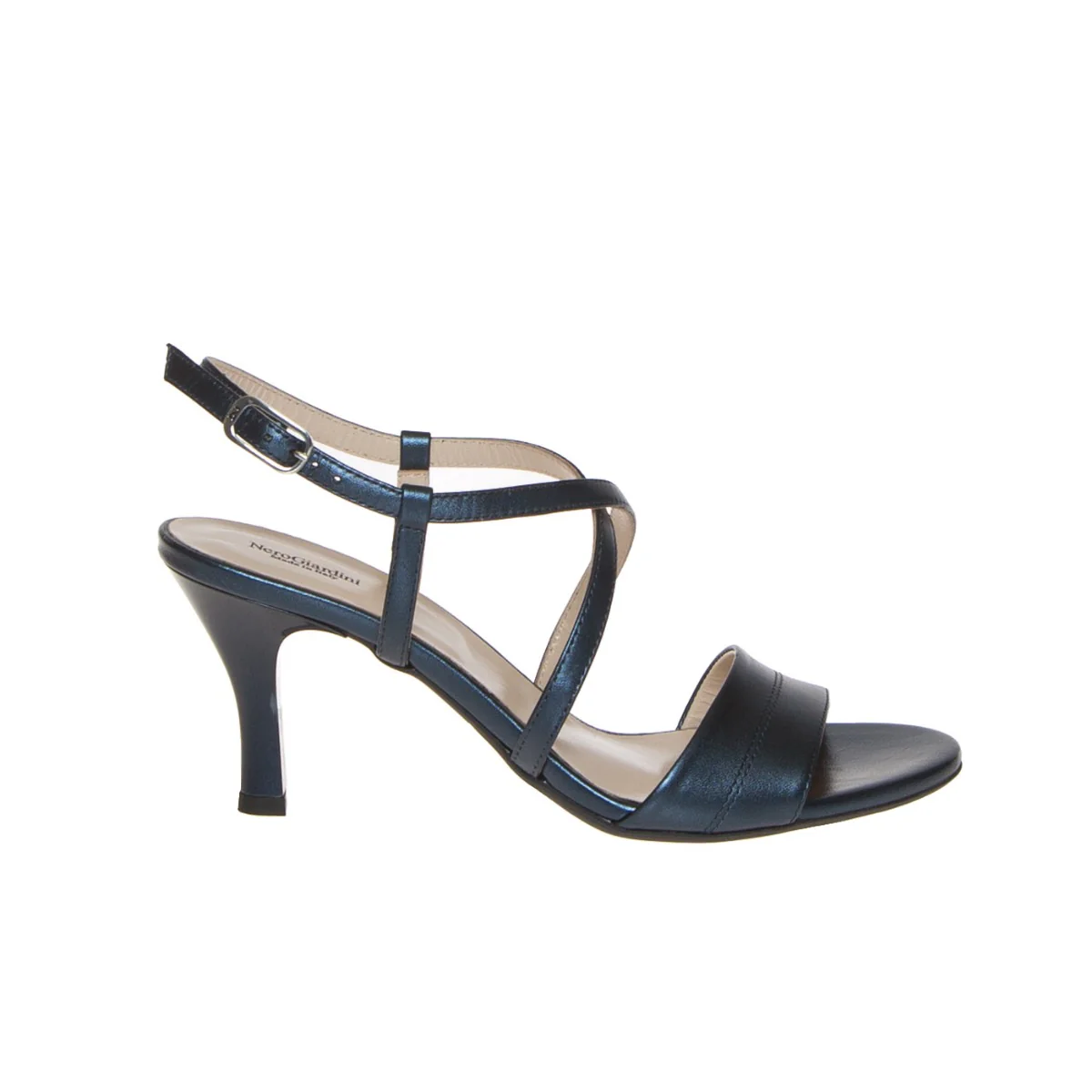 Sandalo elegante cerimonia con fasce pelle laminata blu, di NERO GIARDINI. Chiuso in caviglia con fibbietta argento; internamente foderata, morbido sottopiede rifinito in pelle. Suola in gomma antiscivolo, tacco verniciato metalizzato in tinta altezza 8 cm, leggero platform interno rivestito 0.5 cm. Calzatura con vestibilità comoda; ideata, disegnata e realizzata in Italia, prodotto made in Italy.