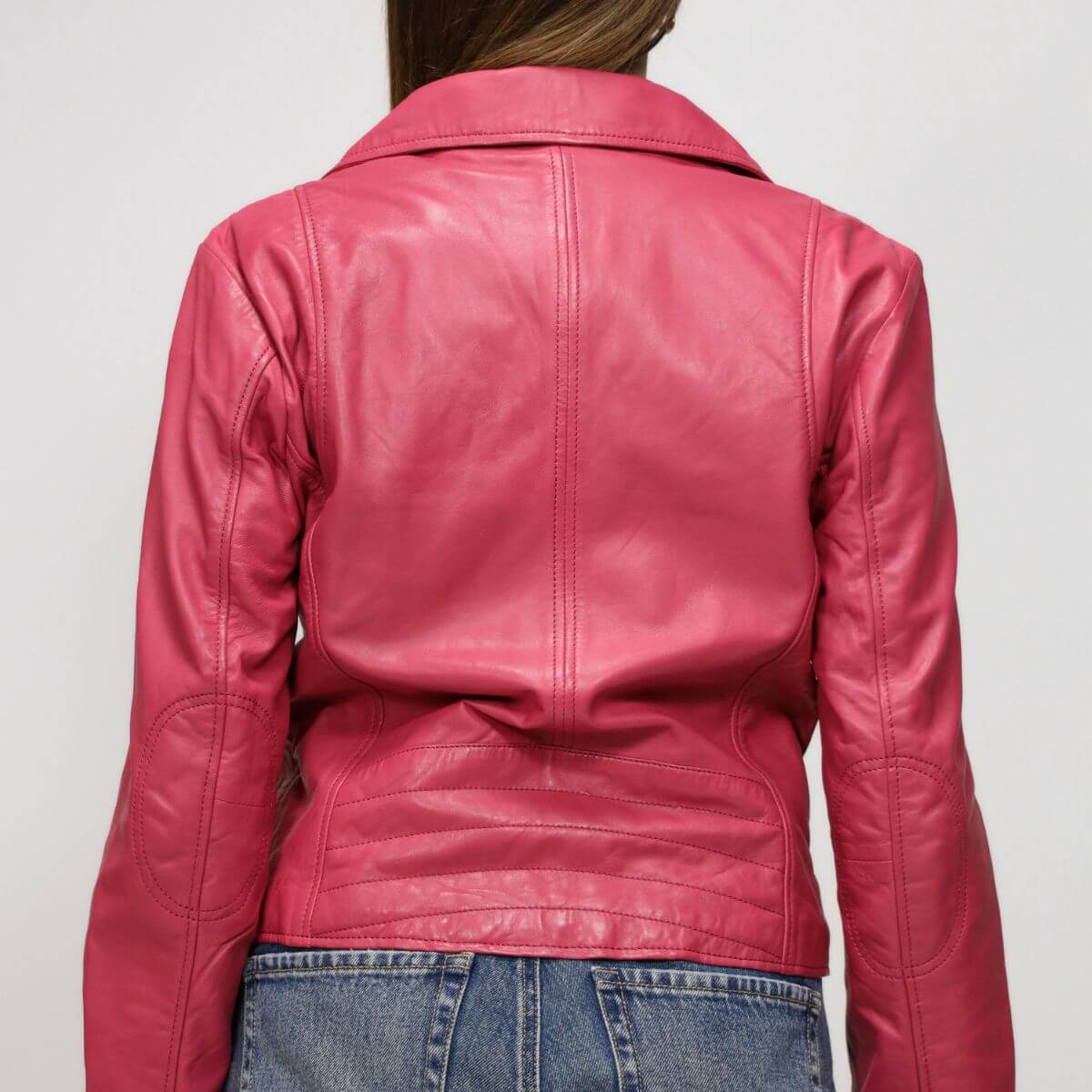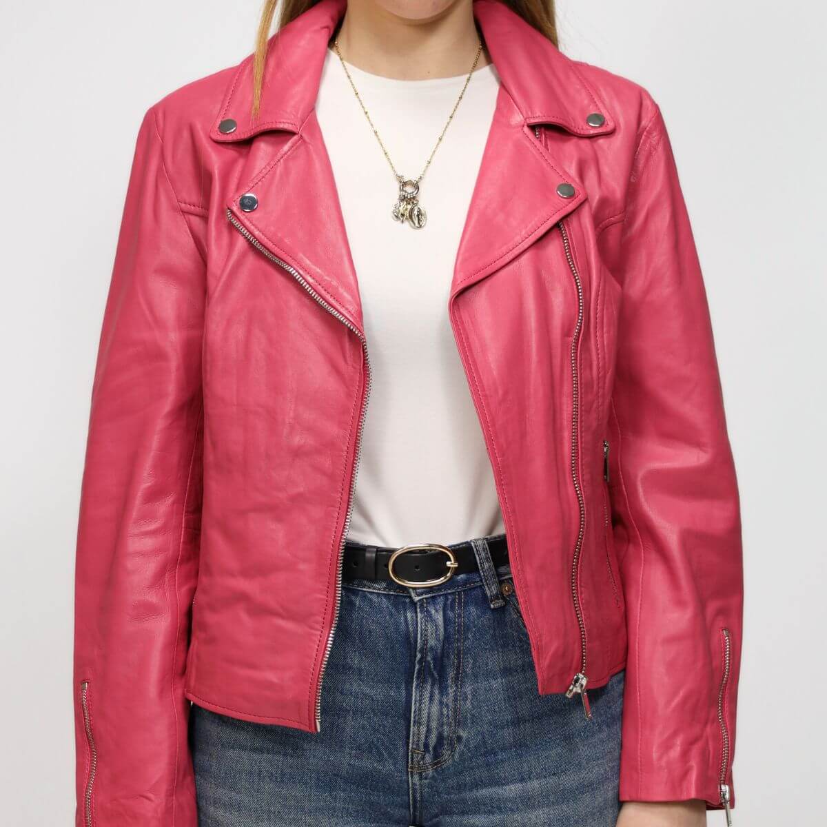 Biker da donna di RINO & PELLE, realizzato in pelle magenta con chiusura con zip. Interno foderato.