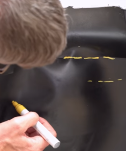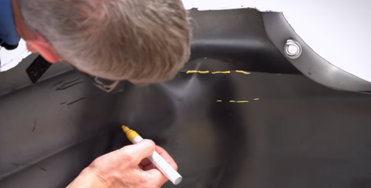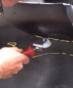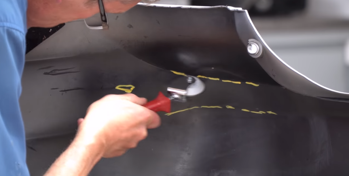 Sulla lamiera, usa un pennarello per contrassegnare la posizione del danno sul retro del pannello. Usa i rulli per eliminare le ammaccature e ridefinire le linee del pezzo danneggiato.