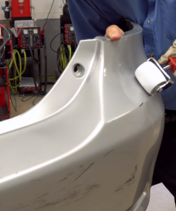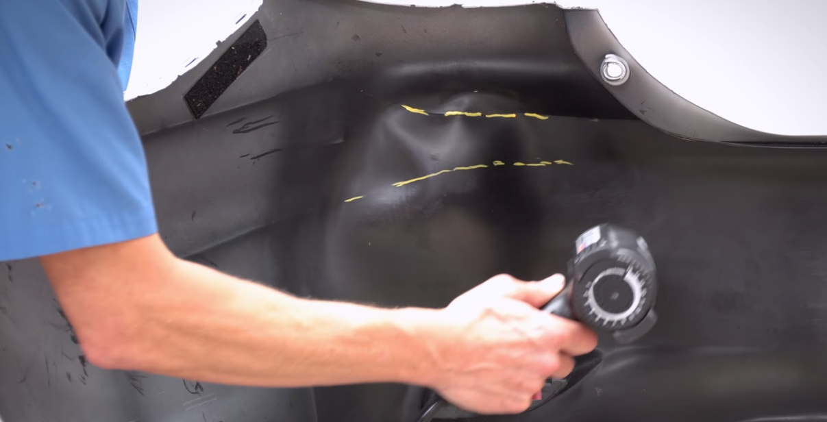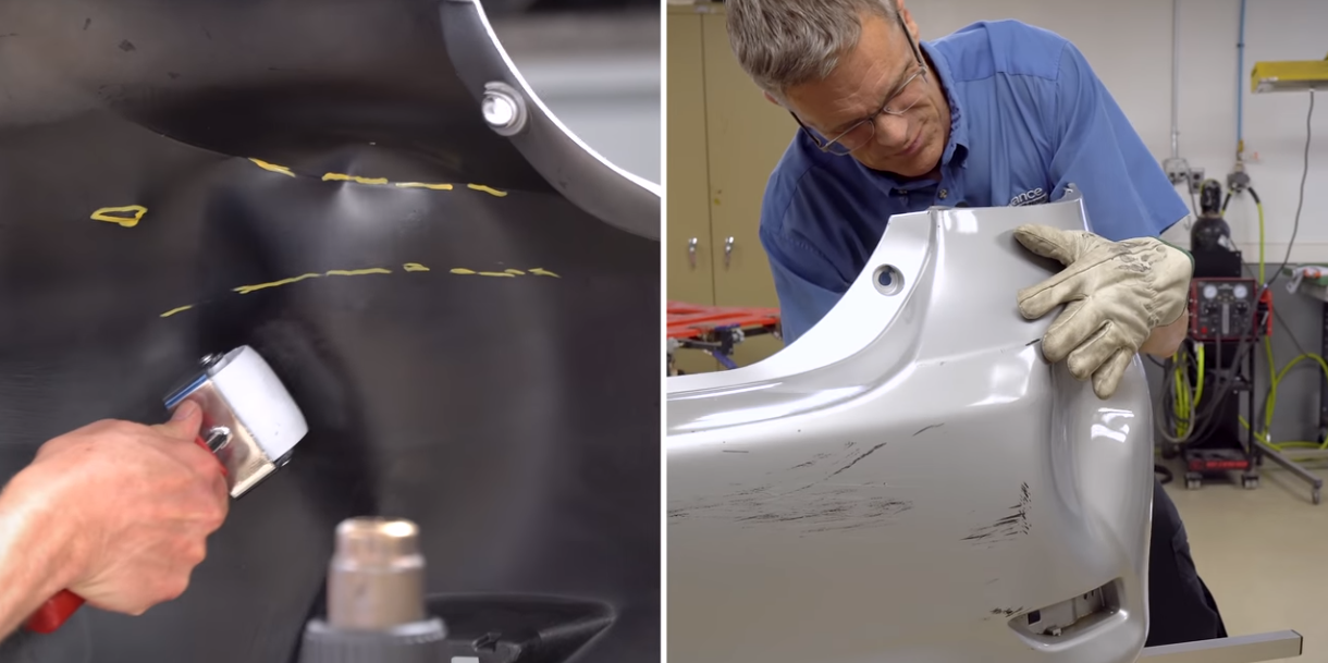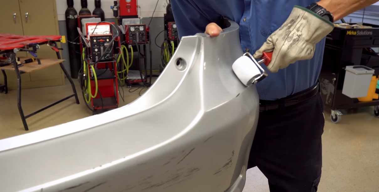Per utilizzare i rulli, riscaldare prima il paraurti con una pistola termica per ammorbidire la plastica. Una volta che l’intera area è troppo calda per essere toccata, inizia a spingere con i rulli. Usa i diversi rulli per ristabilire le linee del componente e massaggia le distorsioni attorno ai bordi dell’ammaccatura originale dove la plastica è stata allungata. Puoi anche usare l’estremità smussata del manico per spingere le ammaccature secondo necessità. Dopo aver lasciato raffreddare la plastica, carteggiare l’area con grana 80 per rivelare eventuali punti alti e bassi. Riscalda il paraurti se necessario, quindi continua a lavorare i punti bassi verso l’alto e i punti alti verso il basso per ripristinare il profilo. Alla fine, dovresti essere in grado di risolvere l’ammaccatura con poco o nessun riempitivo.
