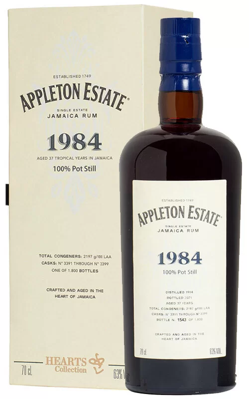 Nuovo imbottigliamento della serie “Hearts Collection”, un rum 100% Pot Still selezionato dalle ricchissime cantine di Appleton Estate, la più antica distilleria di rum della Giamaica; la Master Blender Joy Spence, insieme a Luca Gargano, ha lavorato ad un invecchiamento mai avvenuto nel clima tropicale giamaicano, da una distillazione in un Forsyth Pot Still: distillato nel 1984 e imbottigliato nel 2021, prodotto in 1800 bottiglie, è il più vecchio 100% Pot Still rum completamente invecchiato in clima tropicale mai imbottigliato nella storia. Ci accoglie al naso con note di cuoio, pellame, fieno, spezie scure, erbe aromatiche secche e datteri sotto spirito, per un sorso caldissimo, potente, di grande personalità, che richiama i sentori già percepiti all’olfatto ma con una nota legnosa lievemente fumée.