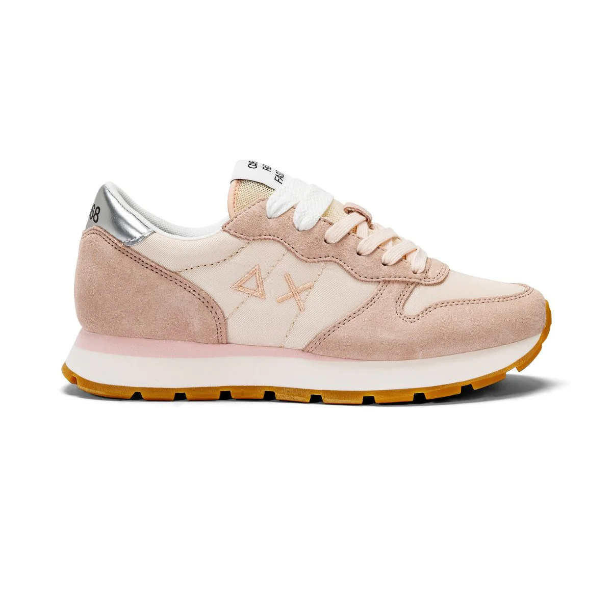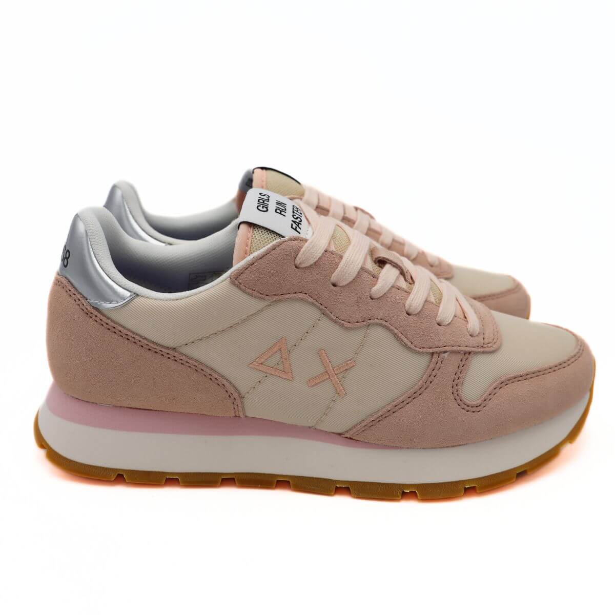 Sneaker, da donna, di SUN68. Tomaia realizzata in tessuto rosa cipria con inserti in camoscio, tallone argento laminato. Interno e sottopiede, removibile, foderati in tessuto. Chiusura con lacci (lacci colorati in dotazione). Suola running in gomma.