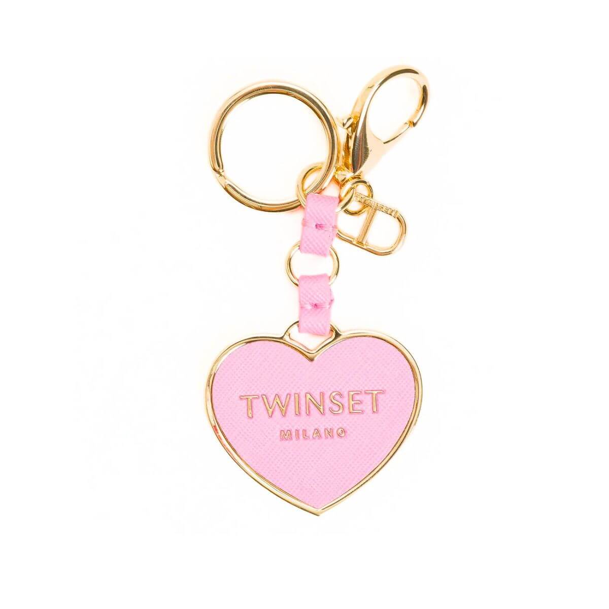 Portachiavi a cuore di TWINSET in metallo dorato con logo lettering, moschettone, anello e charm Oval T.