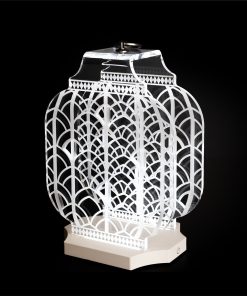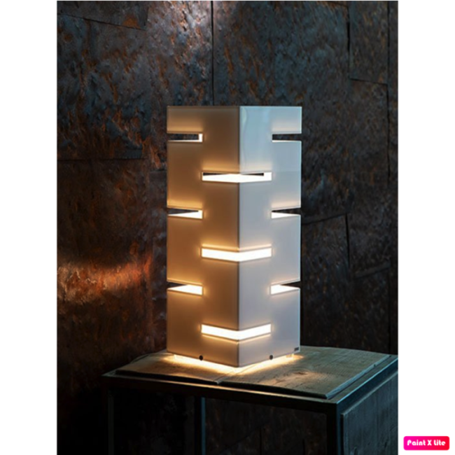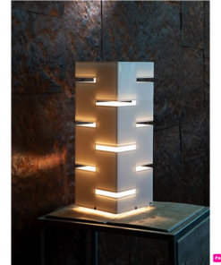 Lampada piccola abat-jour in cristallo acrilico bicolore con intagli e portalampada grigio, della linea Quadra by Vesta.